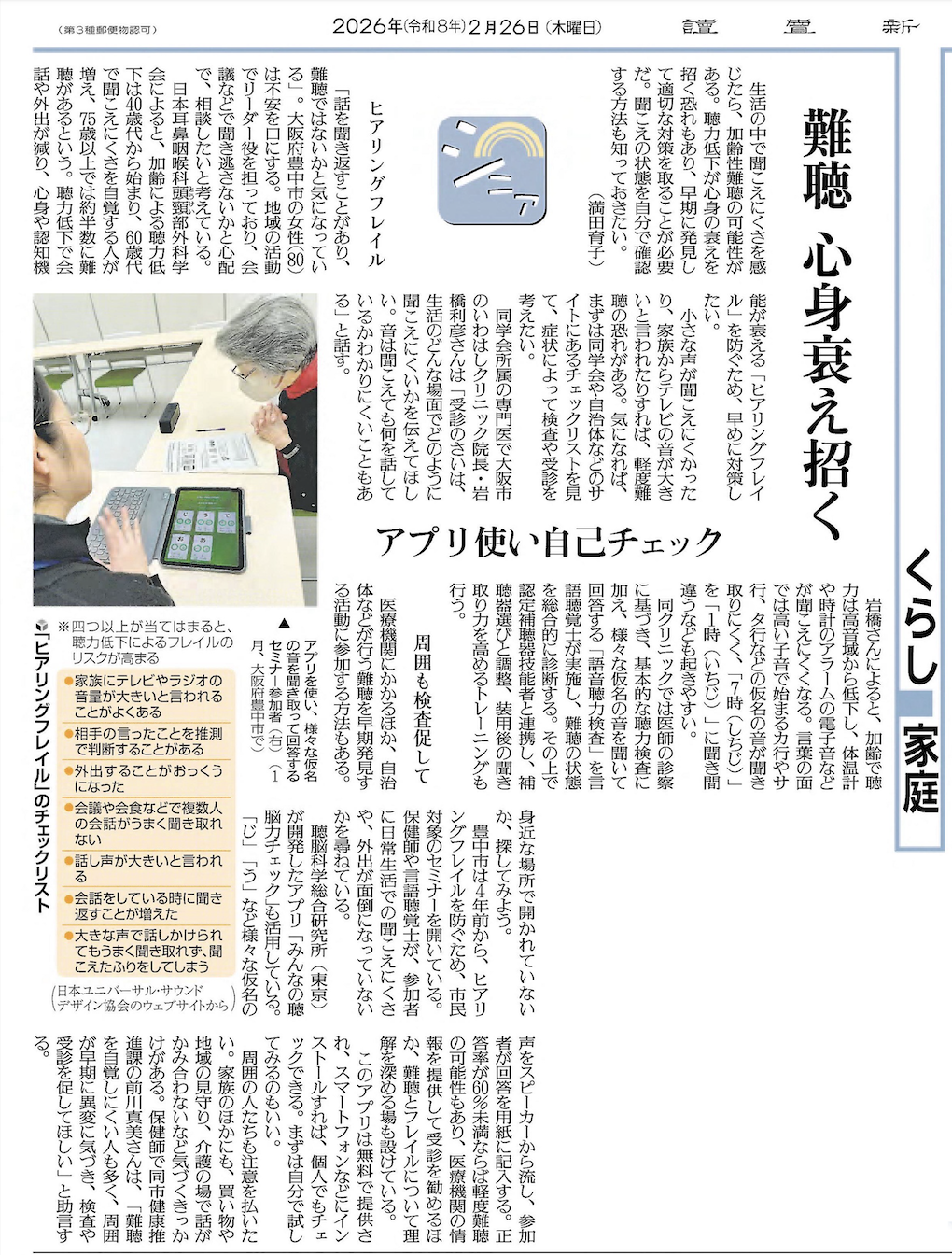 2026年2月26日(木)付の読売新聞「くらし・家庭」面に、ヒアリングフレイルと「みんなの聴脳力®チェック」アプリに関する記事が掲載されました。